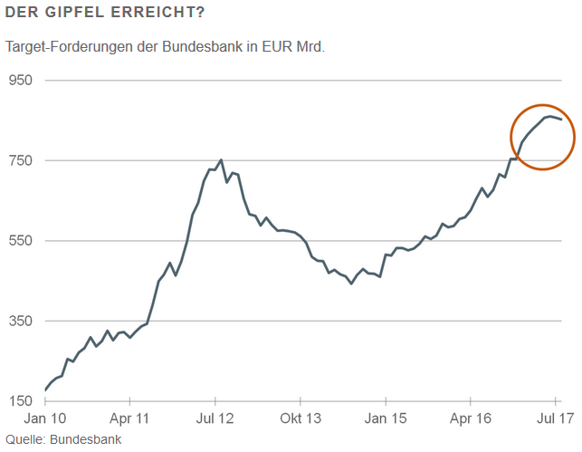 Abzulesen ist das an den Salden des europäischen Zahlungsverkehrssystems Target II. Sie sind eine Art Fieberthermometer der Eurokrise. Immer wenn sie nach oben gehen, ist das ein Zeichen für mangelndes Vertrauen innerhalb der Gemeinschaft. Kapital weicht in sichere Häfen aus. Immer dann, wenn sie zurückgehen, wird die Situation besser. Es gibt "weniger Krise".Der Gipfel erreicht?