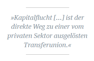 Eines der großen Probleme in der Währungsunion ist seit Jahren die Kapitalflucht. Allein seit Anfang des Jahres haben Italiener und Spanier netto fast EUR 100 Mrd. aus ihren Ländern ins Ausland transferiert, vornehmlich nach Deutschland. Jeder weiß, dass das nicht ewig so weitergehen kann. Die Gelder fehlen in den Defizitstaaten. Sie blähen die Liquidität in der Bundesrepublik noch mehr auf. Die Forderungen Deutschlands an diese Länder nehmen zu. Das ist der direkte Weg zu einer vom privaten Sektor ausgelösten Transferunion.