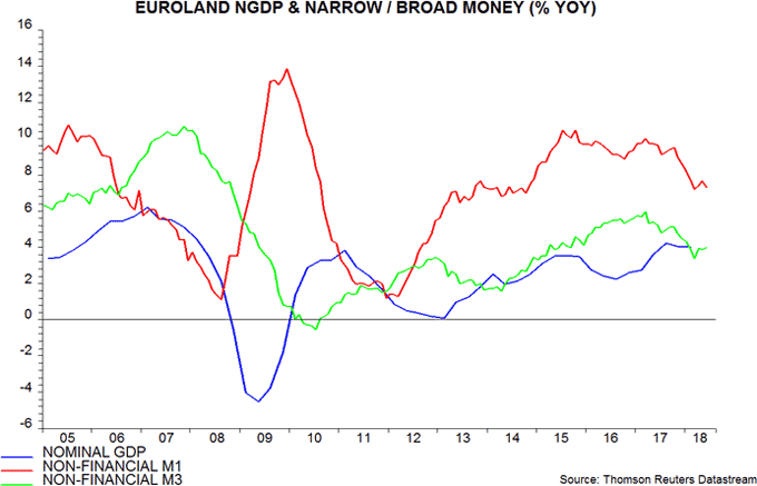 The “surprise” weakening of Euroland economic growth in the first half of 2018 was foreshadowed by a monetary slowdown in late 2017. Monetary trends have stabilised since early 2018, suggesting that economic expansion will continue at around its recent pace through early 2019 – GDP may rise at a 1.25-1.5% annualised rate, below ECB and consensus forecasts of 1.75-2.0%. Country narrow money details show weakness in France, surprising resilience in Italy and growing strength in Greece.