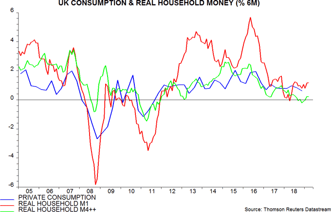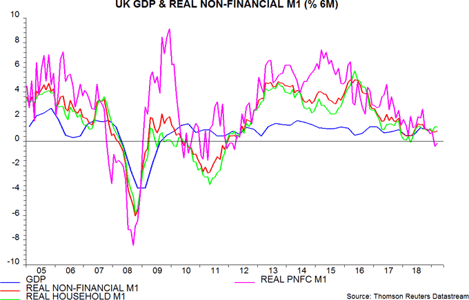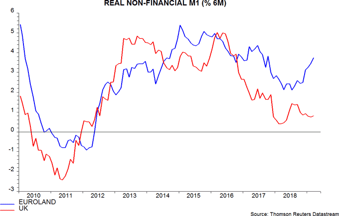 Six-month growth of UK real narrow money, as measured by non-financial M1 deflated by consumer prices, was little changed in March, at only 0.8%. Growth of the equivalent Euroland measure increased to 3.7%, resulting in the widest gap since 2010 – see first chart.