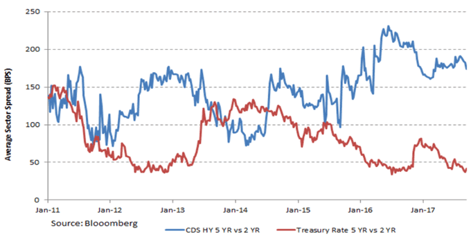 The spread between two- and five-year Treasuries is less than half the average since the end of the global financial crisis, at 41 basis points (bps) versus a mean of 90bps. By contrast, the extra yield enjoyed by sellers of five-year high yield credit default swaps versus two-year high yield credit default swaps stands 30bps higher than the average.