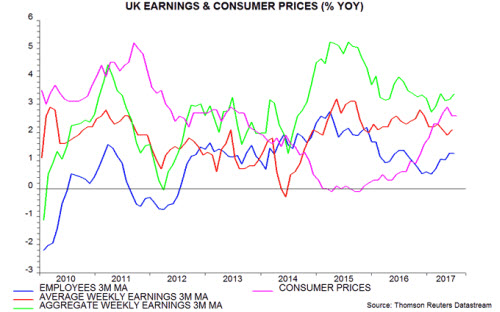 Annual growth in aggregate earnings (i.e. average earnings multiplied by the number of employees) rose to 3.4% in the three months to June, as employment expansion remained solid at 1.2%. Aggregate earnings, therefore, continue to outpace consumer prices, supporting consumption prospects – second chart.