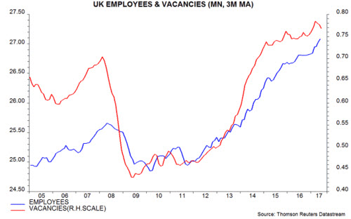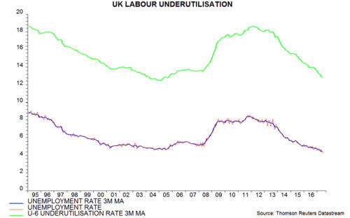 A wider measure of labour underutilisation encompassing involuntary part-time and discouraged workers continues to fall rapidly, reaching its lowest level since 2005 in the latest three months – first chart.