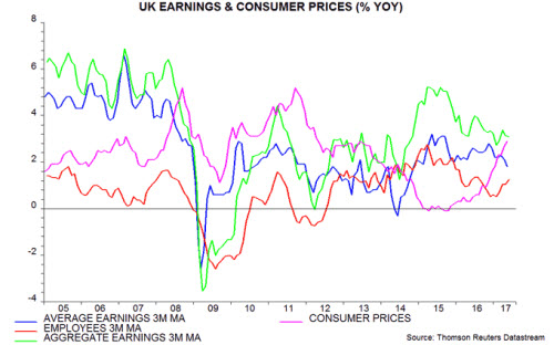 Annual growth in aggregate weekly earnings (i.e. average earnings multiplied by the number of employees) was unchanged at 3.1% over March-May, supported by a further rise in employment expansion to 1.3%, a 10-month high – second chart. Aggregate earnings, therefore, are currently still just outpacing consumer prices – a contrast with the last inflation upsurge over 2009-11, when earnings lagged significantly.