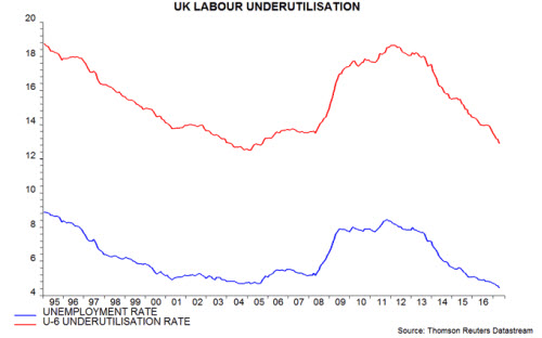 The UK labour market tightened further last quarter, consistent with the view here that the economy has retained momentum and strengthening the case for a “pre-emptive” rise in interest rates, despite continued subdued pay growth.