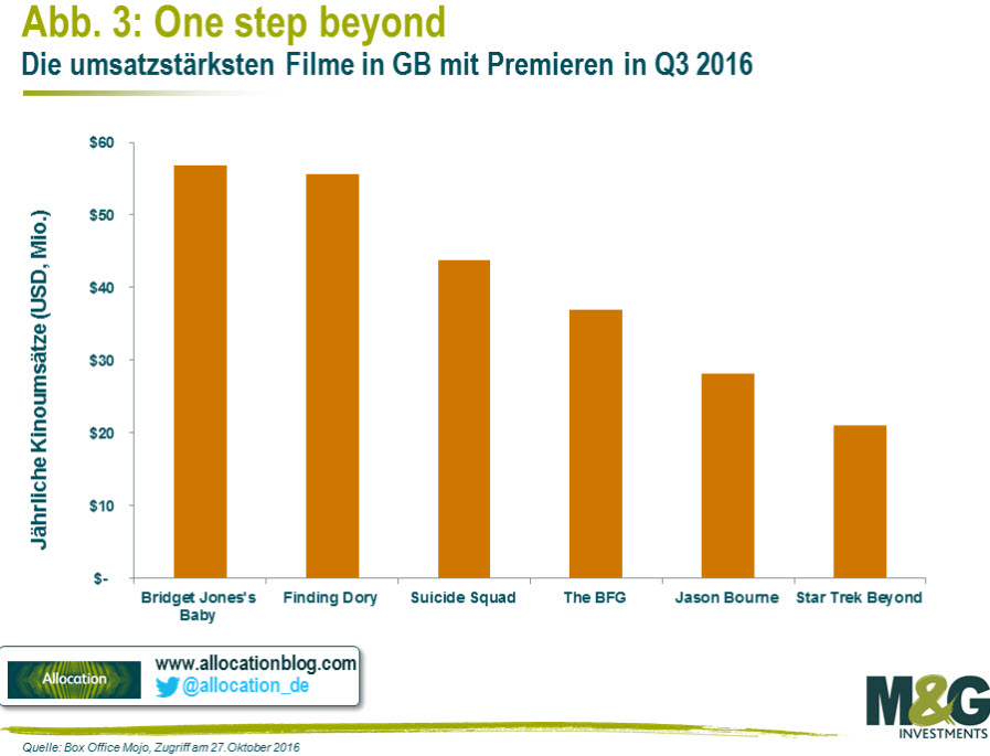 Das wäre jedoch nicht ganz richtig. Das Office for National Statistics (ONS) hat schließlich selbst darauf hingewiesen, dass Film- und Fernsehproduktionen nur 0,6% der gesamten Volkswirtschaft ausmachen und zu einem BIP-Zuwachs von 0,1% geführt haben. Die schlechte Nachricht für die Fans von Star Trek ist, dass Star Trek Beyond nicht einmal zu den fünf umsatzstärksten Filmen im dritten Quartal gehört hat.