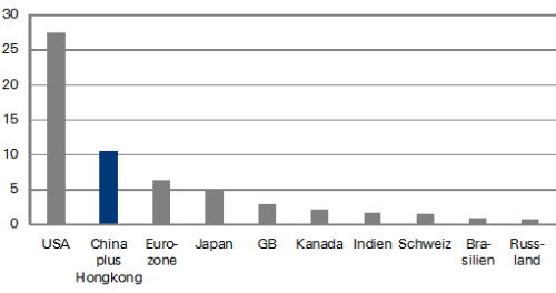 Dass es sich dabei nur um einen ersten Schritt handeln dürfte, zeigt ein Blick auf die Marktkapitalisierung der internationalen Aktienmärkte. So betrug die Marktkapitalisierung aller Aktien 2016 weltweit etwa 65 Bio. USD, des US-Marktes etwa 27 Bio. USD und des chinesischen Festlandmarktes plus Hongkong etwa 10,5 Bio. USD. Der chinesische Aktienmarkt rangierte damit an zweiter Stelle – vor der Eurozone mit einer Marktkapitalisierung aller ihrer Aktien von etwa 6,2 Bio. USD.