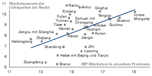 Darüber hinaus ist Chinas Wirtschaft geprägt durch eine breit diversifizierte Palette an Branchen, von denen die Sektoren Dienstleistungen und Technologie in den vergangenen Jahren stark wuchsen. Entsprechend gehören zu den zehn größten börsenkapitalisierten Unternehmen1 schon vier Technologiefirmen, die erfolgreich die Digitalisierungswelle reiten. So zeigte unter anderem eine Studie2 erst kürzlich, dass die chinesische Statistikbehörde das tatsächliche Wirtschaftswachstum in den vergangenen Jahren sogar zu niedrig ausgewiesen haben könnte. Die Autoren vermuten als einen Grund hierfür, dass die Statistikbehörde das Wachstum im Dienstleistungssektor nur unzureichend erfassen kann. Daher griffen die Verfasser der Studie auf einen Ansatz zurück, der oft dazu verwendet wird, um die Wachstumsdynamik in Schwellenländern punktgenauer zu ermitteln. Sie analysierten das Wachstum von Lichtquellen in chinesischen Provinzen anhand von Satellitenaufnahmen bei Nacht. Ein erster Blick zeigt einen engen Zusammenhang zwischen den Wachstumsraten der Wirtschaft in den einzelnen Provinzen und den Lichtquellen dort.