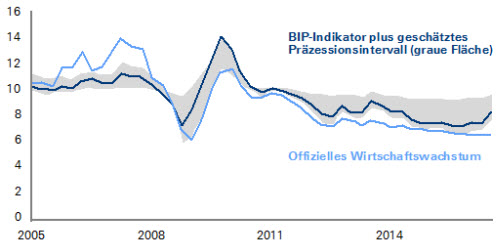 Die Autoren verwendeten die Lichtdaten jedoch nicht direkt dazu, das Wachstum zu bestimmen, sondern leiteten daraus einen gewichteten Indikator für das Bruttoinlandsprodukt (BIP) ab. Dafür nutzten sie die Indikatoren Bankkreditvergabe, Stromproduktion und Schienengüterverkehr, für die zuverlässige Statistiken vorliegen und die damit eine hohe Aussagekraft in puncto Wirtschaftswachstum haben. Die drei Indikatoren sind unter anderem Bestandteil des oft verwendeten „Li-Keqiang-Index“ – dort aber gleichgewichtet. Im Gegensatz dazu kommen die Lichtdaten zum Einsatz, um die Gewichte der drei Indikatoren zu bestimmen. Je besser sich mit einem der drei Indikatoren das Lichtquellenwachstum in den Provinzen erklären lässt, desto höher fällt sein Gewicht aus. Nach Einschätzung der Verfasser der Studie bildet dieser gewichtete Indikator das tatsächliche Wirtschaftswachstum besser ab als die offizielle BIP-Statistik.