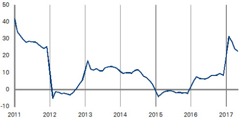 Nach den Ergebnissen der Analyse erhält die Bankkreditvergabe ein etwa sechs- bis achtfach größeres Gewicht als der Schienengüterverkehr, während das Gewicht der Stromproduktion in etwa dazwischen liegt. Die hohe Abhängigkeit des Wirtschaftswachstums in den vergangenen Jahren von der Kreditvergabe sowie die merklich steigende Verschuldung der Staatsunternehmen in Kombination mit den Risiken einer Preisblase an den Immobilienmärkten sind Risikofaktoren für die kommenden Jahre. Wahrscheinlich wartet die chinesische Führung noch den 19. Parteitag der Kommunistischen Partei Chinas im Herbst ab, bevor sie die makroökonomischen Risiken ernsthaft angehen wird. Eigentlich lassen sich die Risiken nur nennenswert reduzieren, wenn Staatsunternehmen ihre Verschuldung reduzieren und weniger Kredite aufnehmen, was automatisch ein geringeres Wirtschaftswachstum zur Folge hätte. Chinas Regierung befindet sich damit in einem schwierigen Balanceakt, da sie ein für das Wirtschaftswachstum und den Verschuldungsabbau zugleich optimales Kreditwachstum finden muss. Dazu sind unter anderem Strukturreformen und eine umfassende Restrukturierung der Staatsunternehmen notwendig. Im Einklang mit dem neuen BIP-Indikator wuchs Chinas Wirtschaft im ersten Halbjahr solide, zudem entwickelten sich zuverlässige Frühindikatoren zuletzt positiv. Als günstiges Vorzeichen werten wir vor allem, dass sich die Gewinne der Industrieunternehmen in diesem Jahr erholt haben. Die Unternehmen können somit ihre Schulden bedienen und gleichzeitig die Investitionsausgaben erhöhen.