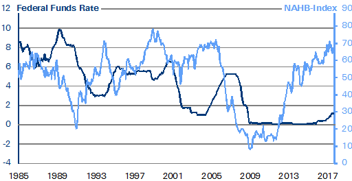 Interessanter sind dagegen der Empire State Index (Montag) und der Philadelphia Fed Index (Donnerstag), da sie einen Blick auf die zukünftigen Investitionsabsichten der Unternehmen erlauben. Auch der NAHB-Index (Dienstag) ist spannend, da er die Entwicklung am frühzyklischen Wohnimmobilienmarkt widerspiegelt. In der Vergangenheit war er sogar ein guter Frühindikator für die Zinspolitik der Fed. Solange der NAHB-Index um einen Wert von 60 schwankt, dürfte der Zinserhöhungszyklus der Fed intakt sein.