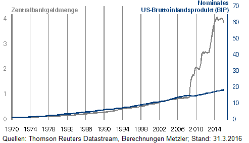 Die massive Expansion der Zentralbankgeldmenge der wichtigsten Notenbanken seit der Finanzmarktkrise weckte Ängste vor einem merklichen Anstieg der Inflation, da früher in Krisenzeiten oft die Notenpresse eingesetzt wurde, um sich mithilfe einer Geldentwertung der Schulden zu entledigen. So stieg beispielsweise die Zentralbankgeldmenge in den USA von etwa 850 Mrd. USD Ende 2007 auf derzeit etwa 4,0 Bio. USD.