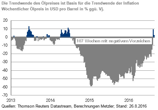 Allein eine Seitwärtsbewegung des Ölpreises zwischen 40 und 60 USD pro Barrel in den kommenden Monaten reicht schon aus, um die Inflationsrate in der Eurozone im Dezember auf über 1,0 % steigen zu lassen und Anfang 2017 sogar bis auf 1,6 %. Sicherlich ist der binnenwirtschaftliche Preisdruck derzeit nur gering - wie eine Kerninflationsrate von nur 0,9 % im Juli belegt - mit anhaltendem Wirtschaftsaufschwung dürften jedoch die Lohnstückkosten sukzessive steigen und damit einen moderaten Aufwärtstrend der Kerninflation bewirken, sodass der Aufwärtstrend der Inflation nicht nur kurzfristiger Natur ist.
