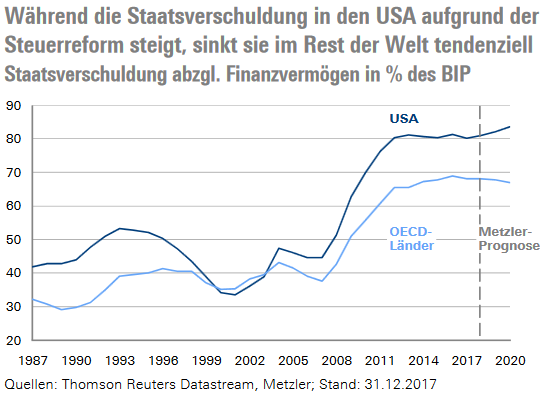 Ein Blick auf die Nettostaatsverschuldung (Bruttostaatsverschuldung abzüglich der Finanzanlagen) in den USA zeigt einen Anstieg von etwa 80 % des BIP im Jahr 2017 auf voraussichtlich 83,5 % des BIP im Jahr 2020.
