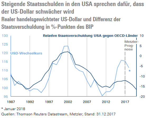 Der reale handelsgewichtete US-Dollar folgte in der Vergangenheit überraschend eng der Entwicklung der relativen Staatsverschuldung zwischen den USA und den OECD-Staaten. Eine Abwertung des US-Dollar gegenüber den Währungen der wichtigsten Handelspartner von mehr als 10 % in den nächsten ein bis zwei Jahren erscheint vor diesem Hintergrund wahrscheinlich.