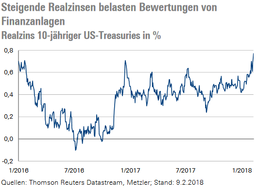 Es ist auffällig, dass Bundesanleihen und US-Treasuries als sichere Häfen von den erheblichen Turbulenzen an den Aktienmärkten nicht profitieren konnten. Einen Grund dafür sehen wir darin, dass die Entwicklungen am Rentenmarkt der Auslöser für die Kursturbulenzen am Aktienmarkt sind. So ist der Renditeanstieg 10-jähriger US-Treasuries von 45 Basispunkten seit Jahresanfang zurückzuführen auf einen Anstieg der Inflationserwartungen von nur 10 Basispunkten und des Realzinses von 35 Basispunkten.