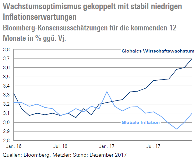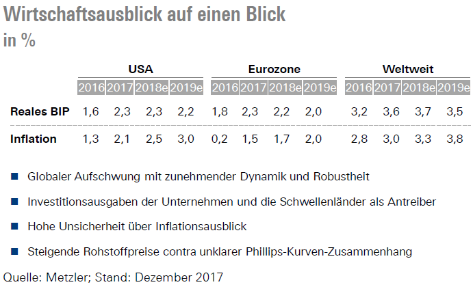 Trotz eines steigenden Optimismus für die Aussichten der Weltwirtschaft sind interessanterweise die Inflationserwartungen in den vergangenen Monaten tendenziell eher gefallen. Dies könnte damit zusammenhängen, dass bisher in keinem der großen Wirtschaftsräume eine stärkere Lohn- oder Preisdynamik festzustellen war. So stellen bereits erste Beobachter die Phillips-Kurve infrage – also den Zusammenhang zwischen Arbeitslosenquote und Lohnsteigerungen. Vielleicht wird die Digitalisierungswelle für eine längere Lohnzurückhaltung sorgen, weil Computer und Roboter perspektivisch immer mehr Aufgaben von den Menschen übernehmen werden. Das ist jedoch nur Spekulation, und ehrlicherweise muss man konzedieren, dass die Unsicherheit über den Inflationsausblick derzeit ungewöhnlich groß ist. Tendenziell gehen wir aber immer noch von einem, wenn auch schwachen Zusammenhang zwischen Arbeitslosenquote und Lohnsteigerungen aus und erwarten daher angesichts einer weiter zurückgehenden Arbeitslosigkeit für 2018 eine moderat steigende Inflation in allen großen Wirtschaftsräumen.