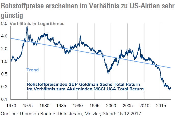Überraschungspotenzial bieten aus unserer Sicht die Rohstoffpreise. Die Investitionszurückhaltung der vergangenen Jahre dürfte 2018 zunehmend zu einem Ungleichgewicht zwischen einem geringen Angebot und einer steigenden Nachfrage führen, sodass sich die Lager immer mehr leeren werden. Darüber hinaus notieren die Rohstoffpreise gemessen am Rohstoffpreisindex S&P Goldman Sachs Total Return auf einem historisch ungewöhnlich niedrigen Niveau gegenüber US-Aktien.
