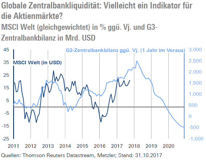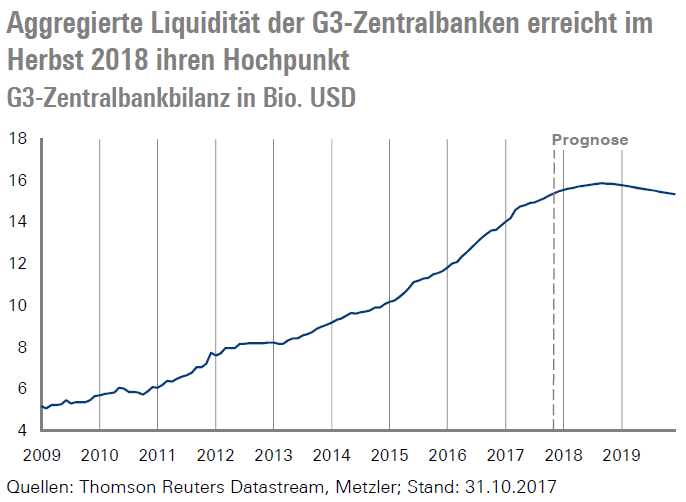 Andererseits wird die Weltwirtschaft oft mit einem Drogenabhängigen verglichen, der auf eine Reduktion der üppigen Zentralbankliquidität mit starken Entzugserscheinungen reagiert. Daher könnte allein schon die ab Herbst 2018 schrumpfende G3-Notenbankbilanz Turbulenzen an den Finanzmärkten und in der Realwirtschaft auslösen. Die historische Blaupause dafür wäre die Wirtschaftskrise in den USA von 1937, als die Fed die Robustheit der nach der Großen Depression einsetzenden Konjunkturerholung überschätzte und diese durch eine zu früh gestraffte Geldpolitik abwürgte.