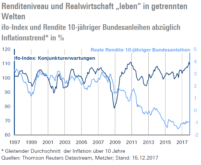 Die hohe Staatsverschuldung muss also mithilfe einer steigenden Inflation und niedrigen Zinskosten unter Kontrolle gehalten werden. Im Endeffekt ist dies eine Umverteilung von Anlegern in Staatsanleihen zu Steuerzahlern. Ein Bild sagt dazu mehr als 1.000 Worte: der boomende ifo-Index einerseits und die negative reale Rendite von zehnjährigen Bundesanleihen andererseits.