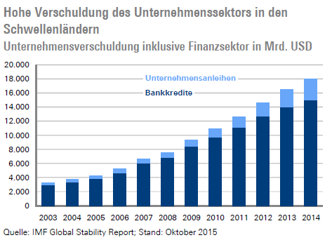 Die Staaten in den Schwellenländern setzten jedoch ihre solide Haushaltspolitik mehr oder weniger fort, sodass das ausländische Anlagekapital nur in einem geringen Umfang in die dortigen Staatsanleihemärkte fließen konnte. Im Bankensystem und den Unternehmen der Schwellenländer fand das ausländische Anlagekapital jedoch willige Abnehmer. Dementsprechend stieg laut Berechnungen des IWF die Verschuldung der Nichtfinanz- und Finanzunternehmen in den Schwellenländern von knapp 8 Billionen USD im Jahr 2008 auf 18 Billionen USD im Jahr 2014. Die Schulden wurden teilweise in US-Dollar aufgenommen. Darüber hinaus wurden teilweise mit kurzlaufenden Schulden langlaufende Kredite vergeben.