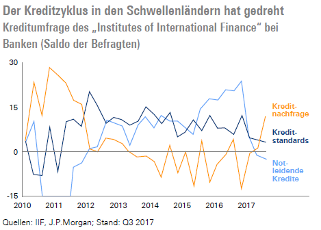 Auch wenn eine Finanzmarktkrise vermieden werden konnte, verschlechterten sich die Finanzierungsbedingungen für die Unternehmen der Schwellenländer erheblich, sodass es zu einer merklichen Wachstumsverlangsamung kam. Erst jetzt, vier Jahre später, scheinen die Schwellenländer den Finanzierungsschock von 2013 überwunden zu haben. So zeigte die Kreditumfrage des "Institute of International Finance" vom August für das dritte Quartal einen Rückgang der notleidenden Kredite, eine merkliche Erholung der Kreditnachfrage sowie eine nur noch geringe Verschärfung der Kreditstandards.