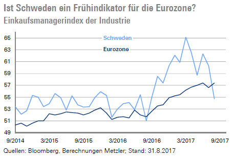 In Schweden schwächte sich der Einkaufsmanager-index der Industrie von 65,1 im März 2017 auf 54,7 im August 2017 merklich ab. Ein Grund dafür dürfte die kräftige Aufwertung der schwedischen Krone von mehr als 15 % gegenüber dem US-Dollar seit Jahresanfang sein. In der Vergangenheit war die Entwicklung in Schweden oft ein guter Frühindikator für die Industrie in der Eurozone. Demnach könnte die Aufwertung des Euro auch die Wachstumsdynamik der Industrie in der Eurozone zunehmend bremsen und zu einem tendenziell fallenden Einkaufsmanagerindex (Freitag) beitragen. Damit steht auch der kontinuierliche Rückgang des ZEW-Erwartungsindex (Dienstag) von 20,6 im März auf 10,0 im August im Einklang.