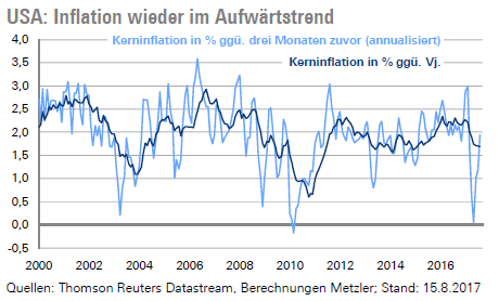 Die geringe Inflationsdynamik in den vergangenen Monaten sorgte für große Fragezeichen bei der US-Notenbank und den Finanzmarktakteuren. Im Mai fiel die Kerninflation in der Betrachtung über drei Monate sogar auf 0 %, was in der Vergangenheit ein typisches Nachrezessionsphänomen war - wie 2003 und 2010. Im August erholte sich die Kerninflation jedoch wieder deutlich und stieg in der Betrachtung über drei Monate auf 1,9 %. Die Normalisierung der Inflation sowie der synchrone globale Aufschwung dürften der US-Notenbank (Mittwoch) die nötige Sicherheit geben, eine Reduktion ihrer Bilanz ab Oktober zu beschließen.