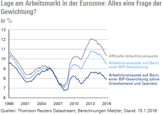 Ohne Spanien und Griechenland lag die Arbeitslosenquote in der Eurozone im Januar sogar nur bei 7,9 %. Aufgrund der BIP-Gewichtung erhält Deutschland automatisch ein größeres Gewicht. Insgesamt erscheint der Arbeitsmarkt in der Eurozone damit in deutlich besserer Verfassung, als es die offizielle Arbeitslosenstatistik ausweist.