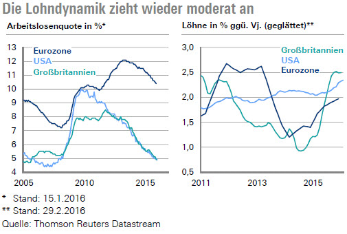 Das geglättete Wachstum der Löhne in der Eurozone fiel im ersten Quartal 2014 mit 1,2 % auf einen Tiefpunkt und beschleunigte sich im Einklang mit der zurückgehenden Arbeitslosenquote auf knapp 2,0 % im vierten Quartal 2015. Die großen Zentralbanken scheinen auf anhaltend steigende Löhne zu hoffen, um damit mittelfristig einen Anstieg der Inflation bewirken zu können. Solange die Konjunkturdaten ein Wirtschaftswachstum von über 1,5 % in den USA und von mehr als 0,5 % in der Eurozone signalisieren, dürfte sich die Erholung am Arbeitsmarkt fortsetzen und damit höhere Lohnsteigerungen ermöglichen. Vor diesem Hintergrund bestehen nicht unerhebliche Risiken, dass die Inflation im zweiten Halbjahr überraschend stark anziehen könnte.