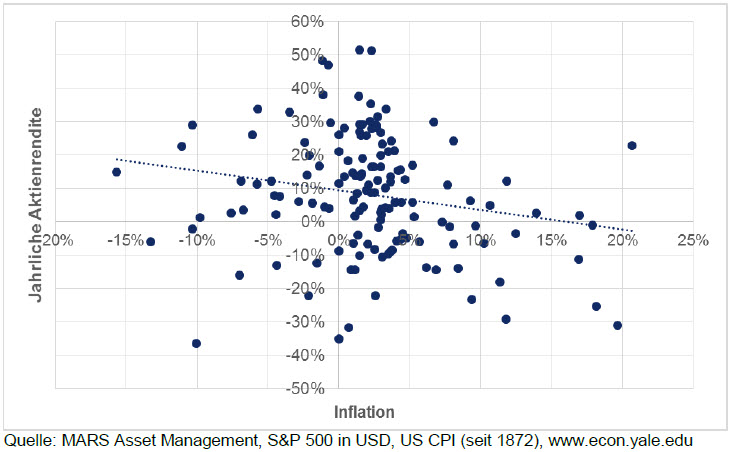 Betrachten wir das Zusammenspiel von Inflation und Aktienmarkt (S&P 500) seit 1872, dann fällt auf, dass beide Größen nur sehr lose interagieren. Es gibt zwar Jahre wie 1931 bis 1933, in denen das Preisniveau um bis zu zehn Prozent sank und die Wirtschaft lähmte. Doch es gab auch Jahre mit sehr positiver Aktienrendite bei ähnlichem Preisverfall. Ein klarer Trend für positive bzw. negative Aktienjahre ist auch nicht bei hoher Inflation zu erkennen. Wenn überhaupt ein schwacher Zusammenhang bestehen sollte, dann werden entgegen der Intuition höhere Aktienrenditen bei niedriger Inflation (Deflation) erzielt (siehe nachfolgende Grafik).