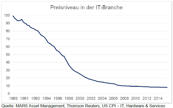 Doch wider Erwarten geht es den IT-Unternehmen trotz Deflation gut. Anscheinend berücksichtigen sowohl Konsumenten als auch Produzenten den Preisverfall, so dass es nicht zur Abwärtsspirale kommt. Außerdem sind die Gewinnmargen gegenüber anderen Sektoren signifikant höher und es findet ein rasanter technologischer Fortschritt statt.