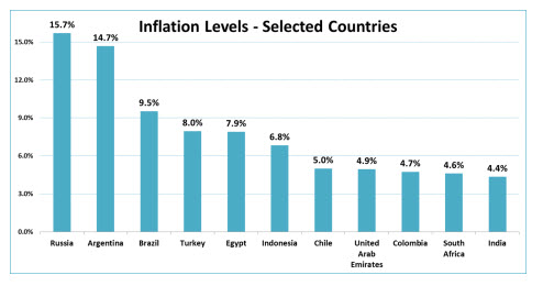 It's no coincidence that the highest inflation levels are found in emerging countries, where currency values have collapsed. Russia, Brazil, and Turkey, all major emerging countries with deflated currencies and sharply rising consumer prices. In fact, all countries in the table above are emerging.