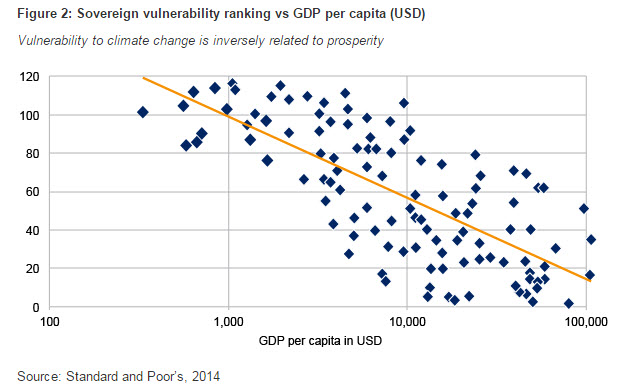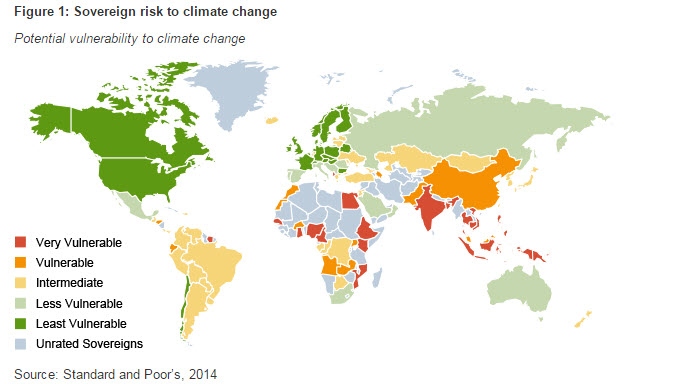 The prediction that developing countries will be disproportionately affected is reinforced by Standard and Poor's research on the influence climate change will have on sovereign risk. Recognising that climate change is a global mega-trend impacting sovereign risk through economic, fiscal and external performance, they find that lower-rated sovereigns appear most exposed. They assess sovereign vulnerability on three measures: share of the population living in coastal areas below five metres of altitude, the share of agriculture in national GDP and a country score from the "vulnerability index" compiled by the Notre Dame University Global Adaption Index. Such an index measures the degree to which a system is susceptible to, and unable to cope with, adverse effects of climate change. Based on these measures we can interpret the results in part as the susceptibility of an economy to climate change. Figure 1 below summarises the results on a world map. In line with much of the economic literature, many developing nations appear most vulnerable to climate change during the remainder of the current century.