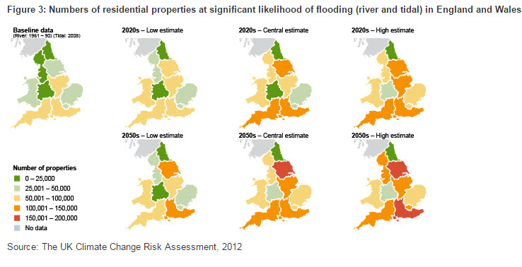 In the UK, the average temperature is now 1°C higher that it was 100 years ago and 0.5°C higher than it was in the 1970s. As a higher latitude country, it is believed that the UK will fare better than many developing nations as global warming progresses. That is not to say the nation will escape the costs of climate change - particularly given its significant coastline where rising sea levels pose an obvious threat. According to Stern, estimates of the cost of floods to the UK economy as a result of 3°C - 4°C of warming are in the region of 0.2% - 0.4% of GDP annually by the middle of the century, if flood management efforts are not strengthened. In England, the south and parts of Yorkshire and Humberside are forecast to experience the greatest impact from flooding by 2050 as shown by Figure 3.