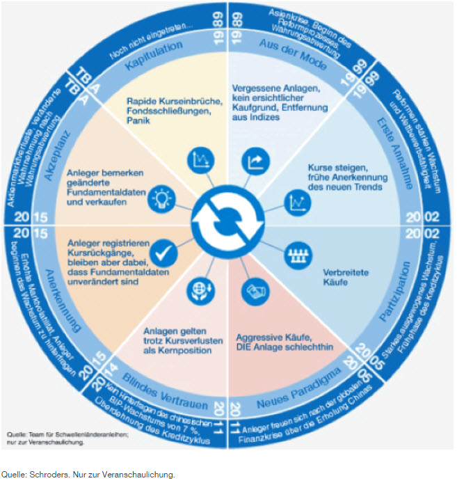 Anleger sollten Anlagen dann kaufen, wenn die Phase des „außer Mode gekommen seins“ vorüber ist und genau dann verkaufen, wenn die Phase des „blinden Vertrauens“ beginnt.Derzeit befindet sich China in der „Akzeptanz“-Phase des Zyklus. Zur „Kapitulation“ ist es bisher nicht gekommen, doch die Wirtschaft könnte vor einer neuen Hausse noch viele Jahre lang „aus der Mode“ bleiben.