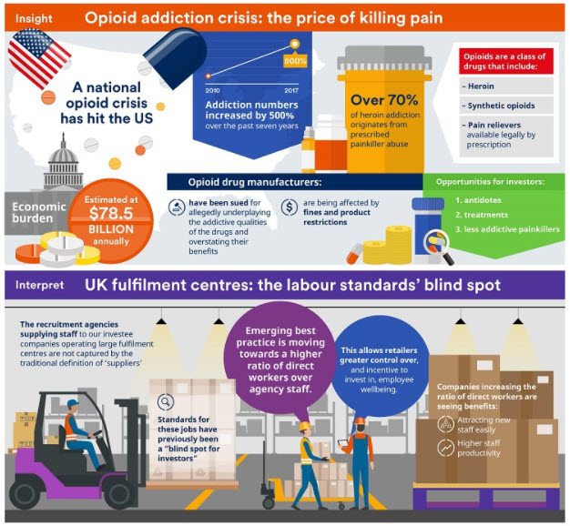 In this quarter's infographic we focus on the cost of opioid addiction in the US and the labour standards blindspot in the UK.