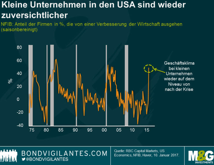 Anders als in diesen dunklen Tagen hat die US-Wirtschaft aktuell fast eine Vollbeschäftigung erreicht. Die Wiederentdeckung des Glaubens an die Führung wird auch den Rest der neuen Regierung durchdringen und auf das Verhalten der Führungen in Unternehmen im privaten Sektor übergehen. Dies dürfte den animalischen Instinkten, dem Verbrauchervertrauen und der Wirtschaft zuträglich sein. Mit Blick auf die Anlagemärkte bedeutet das, dass die Notwendigkeit für eine lockere Geldpolitik abnimmt und Unternehmensinvestitionen in bestehende Firmen und Investitionen durch Fusionen und Übernahmen weiter zunehmen dürften.