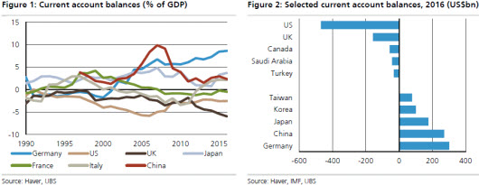 Germany is now running the largest current account surplus globally (reaching US$300 billion in 2016, according to IMF estimates), well ahead of China and Japan, and one the largest among advanced economies as a share of GDP, on track to reach 8.6% this year (Figure 1 and Figure 2).1 The size of the surplus continues to feature prominently in international and European policy discussions, and is a key reason for international organisations to demand more stimulative German fiscal policies aimed at raising domestic demand and thus import growth.