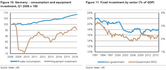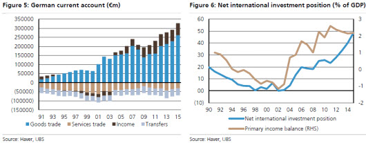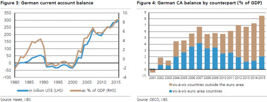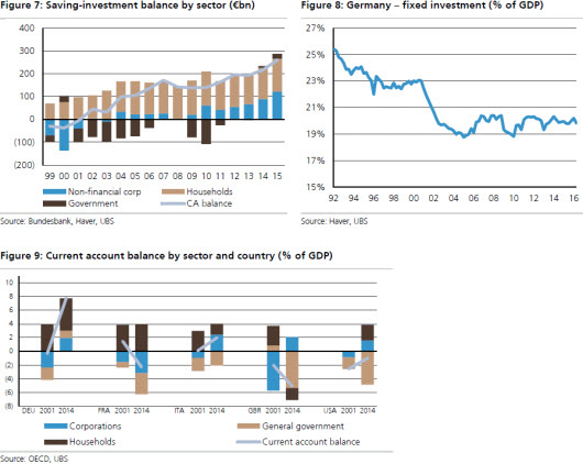 First, looking at the trade and income side, a larger trade balance is the main driving factor behind the rising surplus. In recent years, this has partly reflected lower import prices due to a smaller oil bill – but this has affected other oilimporting countries too. However, another important factor, accounting for around 20% of the rise since 2000, is rising income flows – basically the return on investment abroad. Income flows have increased from around zero in 2000 to 2% of GDP today, as the stock of German foreign investment has increased substantially, reaching close to 50% of GDP now after years of current account surpluses, and thus foreign asset accumulation.