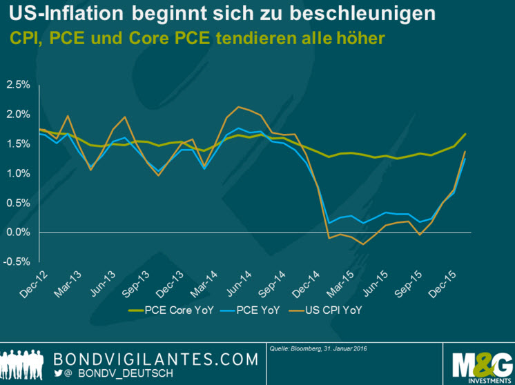 Ein Blick in die jüngste Vergangenheit der Inflationsdaten (Oktober 2015) zeigt, dass der US-amerikanische VPI über das Jahr bei 0,1% lag, der PCE-Deflator (d.h. die tatsächlich von der Fed angestrebte Zielmarke von 2% – siehe meinen kürzlichen Blog) lag bei 0,2% und die Angst vor einer Deflation wucherte vor dem Hintergrund des anhaltenden Preisverfalls im Energie-und Rohstoffsektor, den Sorgen um eine harte Landung in China, dem bevorstehende Zinszyklus und dem (damit im Zusammenhang stehenden) starken Dollar. Der Jahresanfang 2016 brachte eine Reihe neuer Deflationskräfte mit Panikpotenzial ins Spiel: ein erneuter Ölpreisverfall (auf einmal besteht eine reale und in der Vergangenheit für unmöglich gehaltene Wahrscheinlichkeit, dass wir eine Halbierung des Preises in zwei aufeinanderfolgenden Jahren erleben), Unbehagen über eine weitere Abwertung der chinesischen Währung und die wachsende Sorge, dass die USA in eine umfassende Rezession eintreten könnten. Als Folge dieses deflationären Lärms sanken die 5-jährigen Breakeven-Raten zu Anfang Februar auf den Tiefststand von vor der Finanzkrise (0,95%).