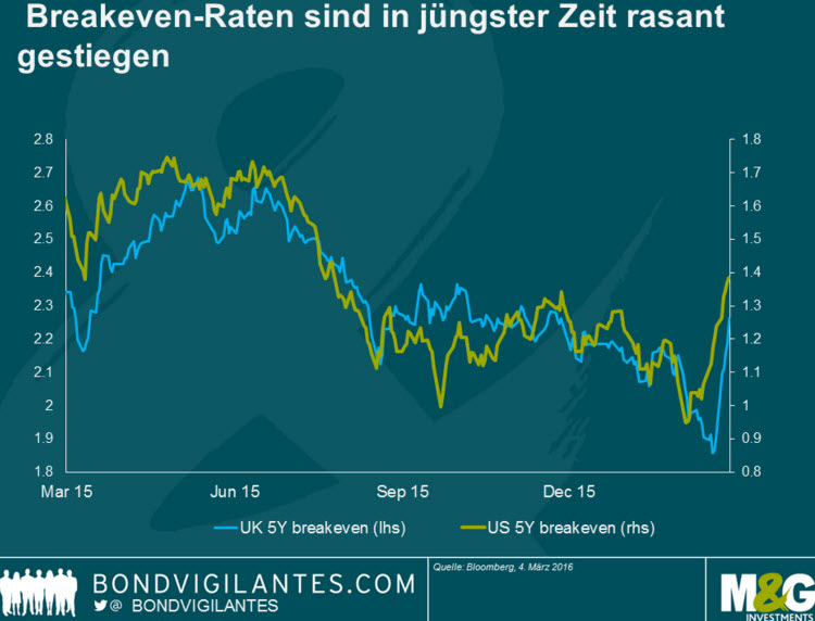 Vor drei Monaten lag die Inflation näher an null als an ihrer Zielmarke. Heute ist sie näher an der Zielmarke als an null und tendiert nach oben. Der Anleihenmarkt hat dies zweifelsohne bemerkt. Wie das obige Schaubild zeigt, sind die US-amerikanischen 5-jährigen Breakeven-Raten in den letzten drei Wochen um ca. 40 Bp gestiegen. Den britischen Pendants erging es ähnlich. Auf kurze Sicht hängt eine Menge vom Ölpreis ab, doch sollten sich die Inflationszahlen weiterhin auf ihre Zielmarke zubewegen, dann erscheint es mir wahrscheinlich, dass Breakeven-Raten noch weiter steigen. Vielleicht sogar deutlich weiter.