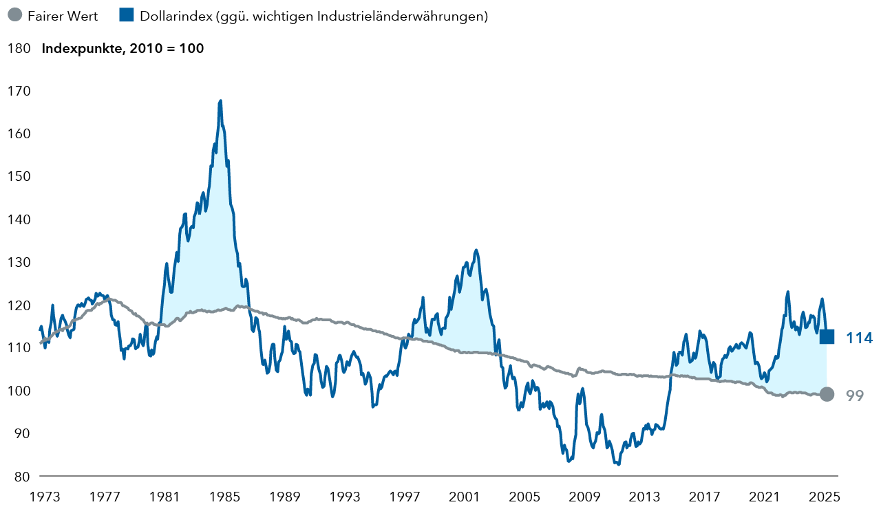 Seit fast zehn Jahren ist der Dollar den Fundamentalmodellen zufolge überbewertet. Noch ist es aber zu früh, um eine Dollarschwäche auszurufen. Dazu müsste erst das US-Wirtschaftswachstum drastisch einbrechen (wenn nicht eine Rezession kommen) bzw. das Wachstum in den übrigen Ländern deutlich zunehmen.