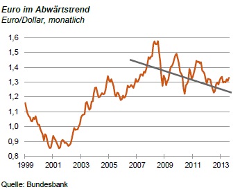 Zunächst eine Warnung: Kurzfristige Bewegung am Devisenmarkt sollte man nicht überbewerten, insbesondere nicht in der Ferienzeit, in der die Umsätze relativ gering sind. Die Grafik zeigt, dass sich trotz der jüngsten Abwertung des Dollar an dem langfristigen Bild nichts geändert hat. Seit dem Beginn der großen Finanzkrise 2008 befindet sich der Euro unter starken Schwankungen in einer leichten Abwärtsbewegung.