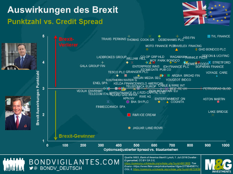 In diesem Umfeld wird es insbesondere inlandsorientierte zyklische Unternehmen treffen, die ihre Produkte aus Übersee beziehen (z.B. Textilhändler). Exporteure von Gütern und Dienstleistungen in Märkte außerhalb der EU könnten demgegenüber sogar einen kleinen Vorteil haben (z.B. Bildungsträger). Die folgende Grafik trägt diese Auswirkungen auf der Y-Achse ein und verwendet (vorbehaltlich sehr subjektiv) einen numerischen Score zwischen 1 und 5 (1für die günstigsten und 5 für die negativsten Folgen. 3 deutet auf nur marginale oder keine Folgen). Die aktuellen Credit Spreads sind auf der X-Achse, um einen Kontext mit Relative Value herzustellen. Es sollte zudem darauf hingewiesen werden, dass Finanzanleihen und in Not geratene Kredite nicht berücksichtigt wurden und Spreads von vielen anderen Faktoren als nur dem Brexit beeinflusst werden.