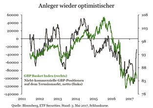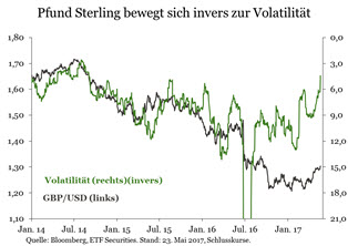 Da die politische Unsicherheit nachlässt, sinkt auf den globalen Devisenmärkten auch die Volatilität. Obwohl sie jetzt schon graduelle Zugewinne des Pfunds erlaubt, dürfte dies unseres Erachtens erst nach den Wahlen am 8. Juni sichtbarer werden.