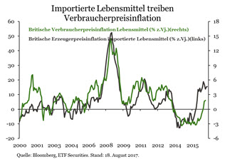Die Inflation hat die Zielmarke der Bank of England überschritten und befindet sich nun auf dem höchsten Stand seit Juli 2013. Im April stieg die Verbraucherpreisinflation auf 2,7 Prozent zum Vorjahr, zugleich nahm die Kerninflation von 1,8 Prozent auf 2,4 Prozent zu. Die Inflation wurde 2017 hauptsächlich importiert, da sich ausländische Lebensmittel und Kraftstoffe infolge des schwächeren Pfunds verteuerten. Der Einfluss der Währungsschwäche lässt jedoch allmählich nach. Die Bank of England wies darauf hin, dass das Pfund seit dem vorherigen Inflationsbericht im Februar aufge¬wertet und zum flacheren Anstieg der Importpreise beigetragen habe. Das um 4 Prozent höhere Pfund befindet sich allerdings immer noch 12 Prozent unter dem Stand nach dem EU-Referendum (1,48).
