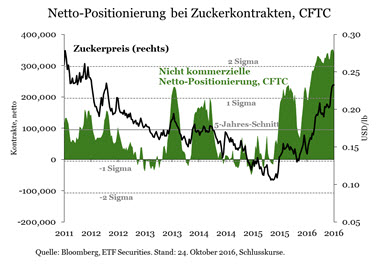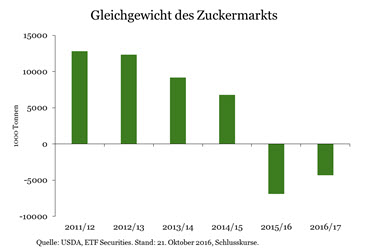 Zucker hat seit Februar 2016 um über 80 % zugelegt, da zu erwarten ist, dass das Produktionsdefizit in sein zweites Jahr geht. Die Preise befinden sich mittlerweile auf einem 5-Jahres-Hoch.