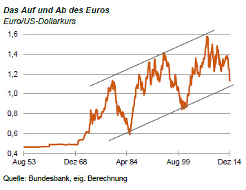 Viertens: Seit Beginn der flexiblen Kurse gibt es drei klar voneinander getrennte große Zyklen. Der erste endete 1985 mit der Dollarhausse unter dem amerikanischen Präsidenten Reagan. Der zweite fand seinen Tiefpunkt um die Jahrtausendwende mit der Schwäche des Euros nach der Einführung der Währungsunion. Den dritten erleben wir gerade jetzt. Bemerkenswert ist, dass die Zyklen gemessen an den Tiefpunkten jeweils 15 Jahre auseinander liegen. Eine solche Regelmäßigkeit könnte auf eine tieferliegende Gesetzmäßigkeit hindeuten. Freilich sehe ich keinen ökonomischen Grund, dass es alle 15 Jahre zu einer Zuspitzung auf den Devisenmärkten kommen sollte. Vielleicht ist es nur Zufall, allerdings ein interessanter Zufall.