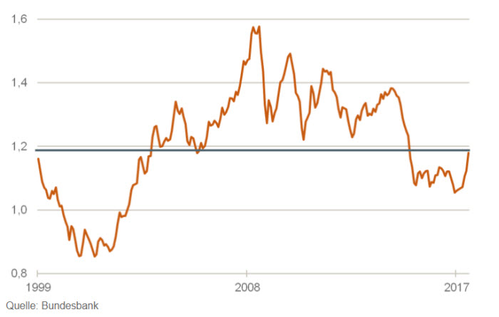 Wenn man noch weiter zurückgeht, so kann man die gegenwärtigen Kurse mit den Tiefkursen Mitte der 80er vergleichen. Das war eine Zeit, in denen die Währungspolitiker nur eines im Sinn hatten, nämlich den Dollar wieder zu schwächen und die D-Mark zu stärken. Es gab das berühmte Plaza-Abkommen, mit dem man das bewerkstelligte. Wenn US-Präsident Trump nicht so viele Vorbehalte gegen internationale Kooperation hätte, würde er sicher auch an so etwas denken. Eine kräftige Abwertung der amerikanischen Währung würde zwar vom politischen Selbstverständnis nicht zu "America First" passen, wäre im Hinblick auf die Schaffung von Arbeitsplätzen hilfreich.